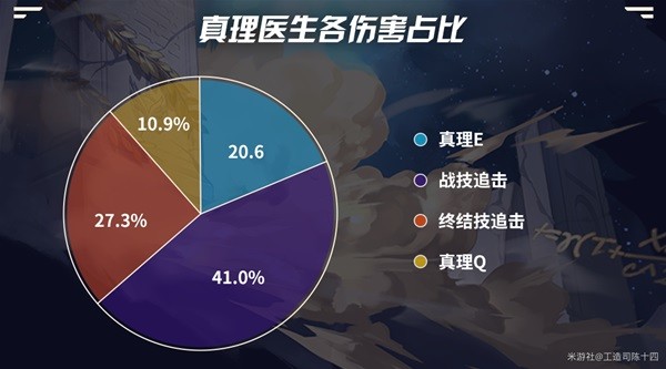 真理医生的终结技+终结技触发的【智者的短见】所带来的2次天赋追加攻击,总倍率还算比较高,在自身的总伤害占比方面,二者相加接近四成。值得为真理医生的这段爆发期关注一下队伍BUFF的分配。