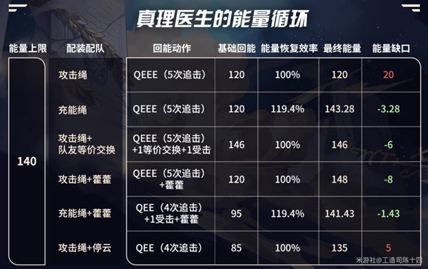 关于攻击绳/充能绳的选择:尽管真理医生的终结技和终结技触发的天赋追击伤害占比不低,能量缺口比较大,但仍然推荐与传统主C一样选择攻击绳。即便是装备充能绳的真理医生能缩短循环轴,从QEEE变为QEE,伤害期望也会低于装备攻击绳的同等情况。