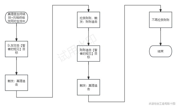 3、与托帕配队时,如果真理医生与托帕同时在终结技状态下:队友攻击【智者的短见】的目标,触发真理医生天赋追加攻击;队友攻击和真理医生天赋追加攻击会拉条账账,触发账账追加攻击;账账的追加攻击【智者的短见】的目标,又会再次触发真理医生天赋追加攻击。但是,真理的最后这次追击,不会再拉条账账了。