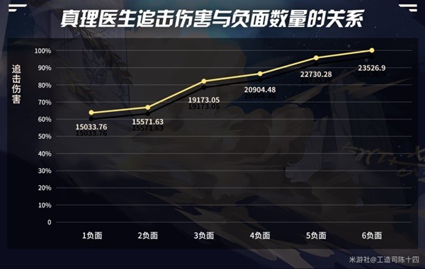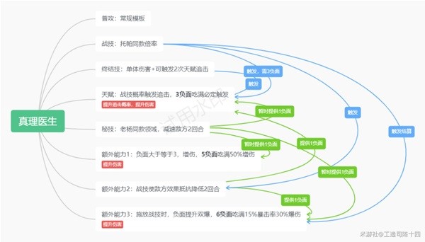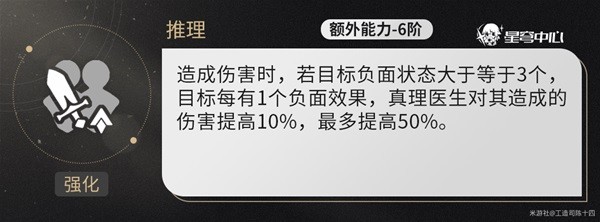 敌方3负面效果及以上时,真理医生战技必定触发天赋追击,通过提升追击概率的方式提升整体伤害,同时【额外能力1:推理】的增伤开始生效;