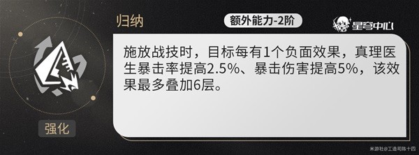 敌方6负面效果及以上时,真理医生吃满【额外能力3:归纳】的双爆提升效果(注意需在施放战技触发结算归纳层数之后)。