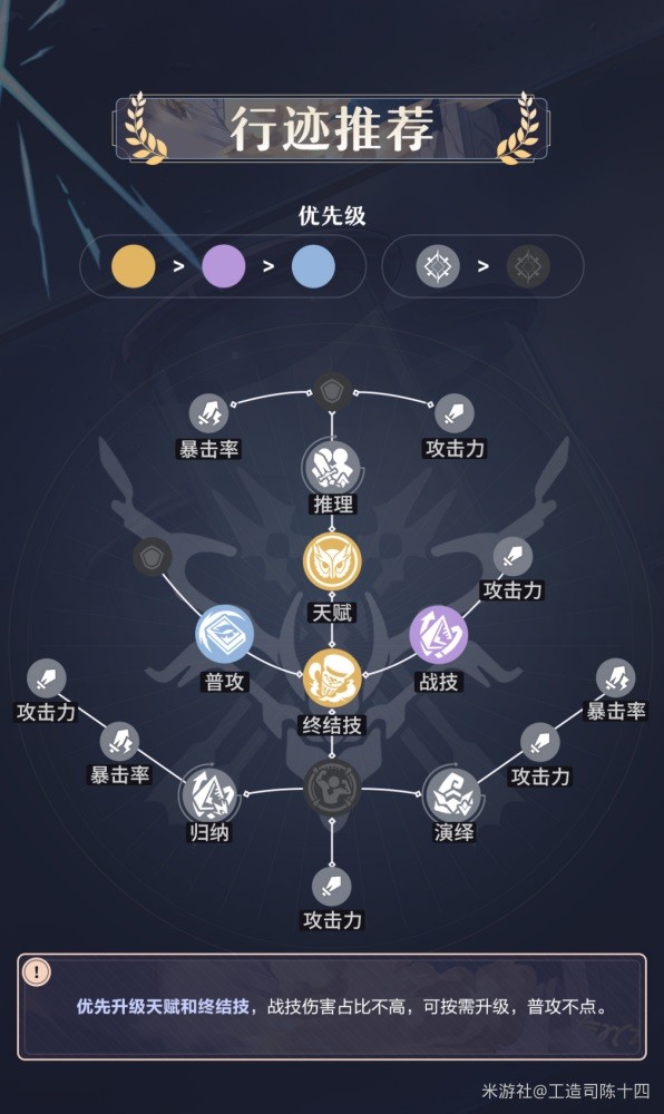 技能加点优先级方面,真理医生总伤占比最高的天赋优先点,终结技次之,战技再次之,普攻不点。
