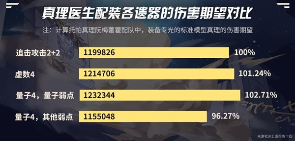 追击2+攻击2是比较合适的选择,选择追击2是因为真理医生的追加攻击伤害占比总伤在七成左右。而只要最佳攻击伤害占比高于五成,选择追击2件套的追击伤害提高20%就优于虚数2件套的虚数伤害提高10%。