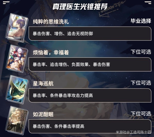真理医生的专属光锥提供的暴伤是真理医生比较需要的,额外暴伤提高的触发方式与真理医生需要负面效果的机制契合,3个负面即可吃满。