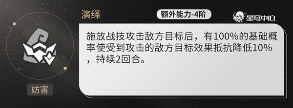 其中两个额外能力是和战技联动的,分别是上负面的【演绎】和提供双暴的【归纳】。【演绎】会给敌人一个效果抵抗降低10%的debuff,基础概率为100%。实际生效概率对常规精英是70%,对BOSS是60%。debuff生效后,则分别是80%和70%的实际生效概率。由于buff存在两回合,且实际生效概率都大于50%,在没有任何效果命中的情况下,这个负面状态是可以常驻的。