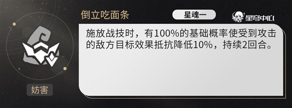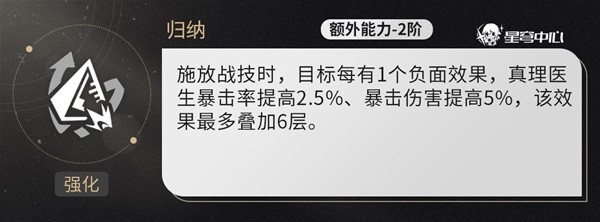 使用战技时会在敌人头上出现概率的图标,如果是100%那就必定触发天赋。在解锁额外能力【归纳】后,会根据战技攻击目标的负面状态数量提供双暴,最多叠加6层,共15%暴击和30%暴伤。