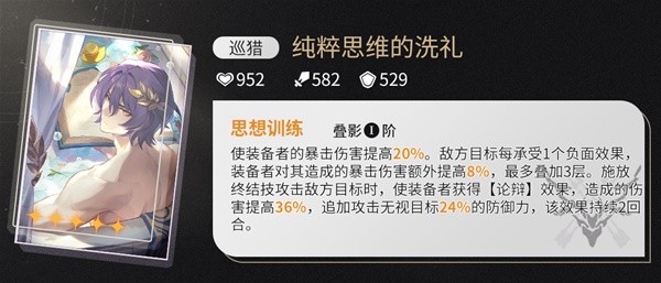 说白了就是44%暴伤、36%增伤和追加攻击24%的无视防御,三个伤害乘区,互不稀释就是纯粹的数值。触发效果也非常简单,只需要三个负面状态吃满暴伤,开大之后吃到增伤和无视防御。
