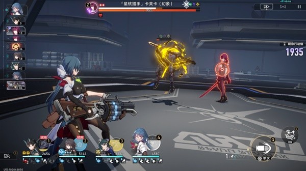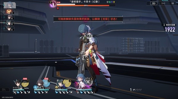饮月回合选择卡芙卡施放三级强普,如果之前留下一个员工没有击破,这个时候饮月就能再自拉条一次,可以用普攻多削韧卡芙卡一次。接着是卡芙卡行动,卡芙卡会直接支配控一个人,只要不是控的娜塔莎,等会娜塔莎就能解,但我这里是娜塔莎被控了,只能放任了。