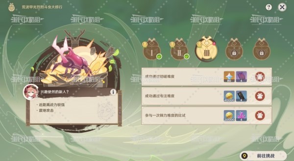 《原神》4.3版本开启了“荒泷甲光烈烈斗虫大修行”新的斗虫挑战活动,每天都会解锁一关斗虫挑战,下面就为大家带来《原神》4.3荒泷斗虫修行第三天满奖励攻略,希望对大家有所帮助。