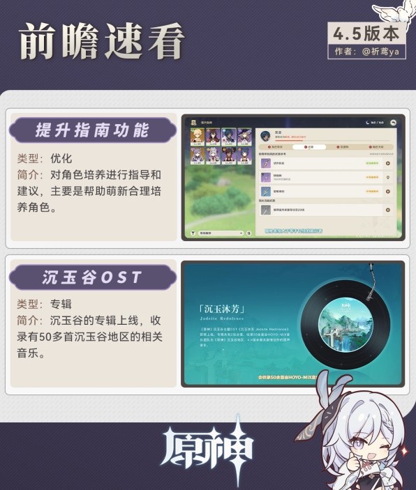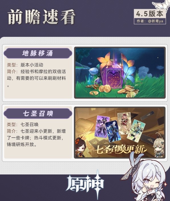 《原神》4.5版本即将更新,很多玩家想要知道新版本中有多少活动玩法,下面请看“祈鸢ya”带来的《原神》4.5版本更新前瞻,希望能够帮助大家。