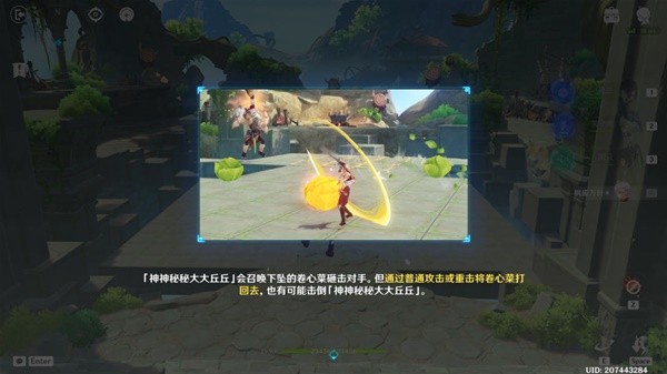 1.用普攻或者重击将卷心菜打回去,击倒丘丘人