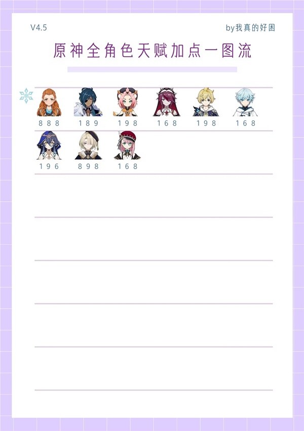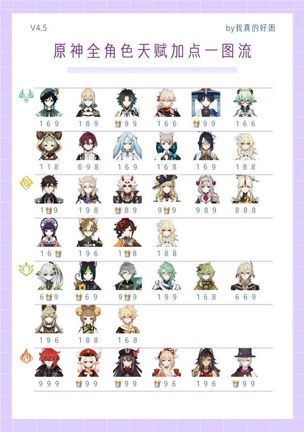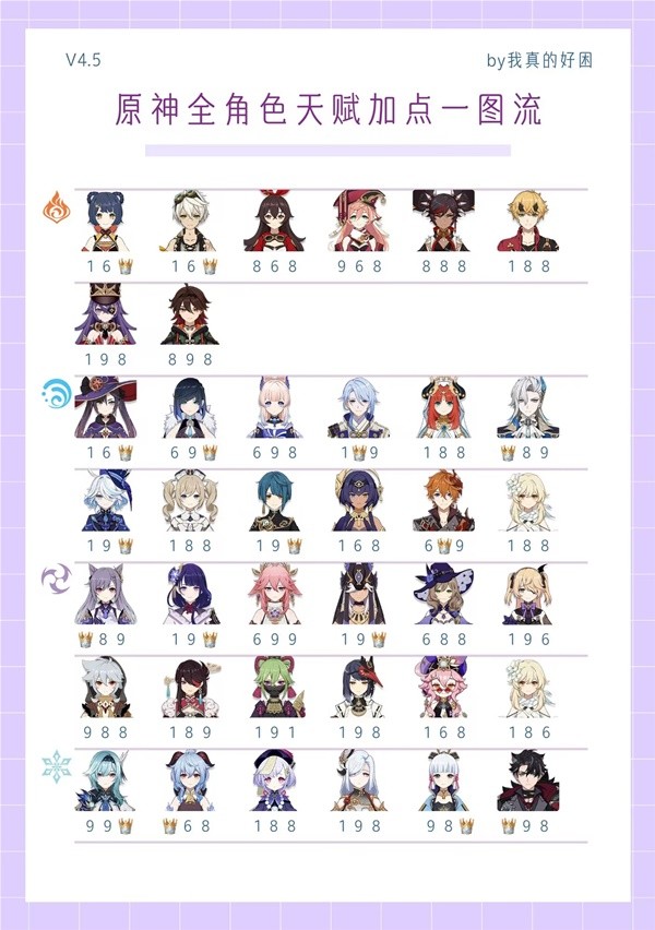 《原神》中天赋是角色的重要战力组成部分,但我们前期资源有限,应该怎样去合理分配资源呢?下面请看由“我真的好困t”为各位旅行者带来的《原神》4.5上半全角色天赋加点推荐,希望各位旅行者能够喜欢。