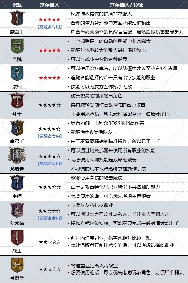 前期推荐玩家选择盗贼,主追随者用法师,两个支援选择战士的队伍。玩家角色的职业推荐选择具有强力大师技能和成长潜力巨大的盗贼,也可以根据喜好来选择其他容易上手的职业。