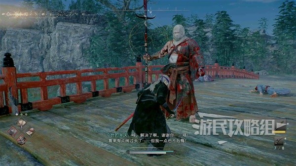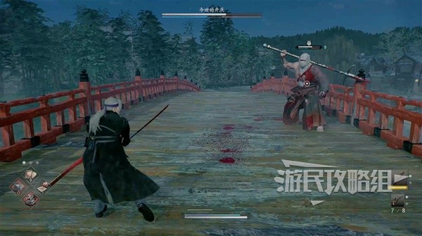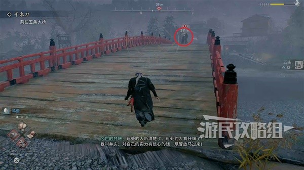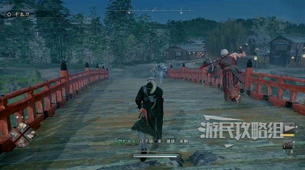 来到此处与戴帽子的武士对话得知附近有一个喜欢在桥上与别人单挑的疯子,每次单挑都会抢走别人的武器。