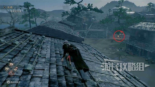从房顶往右看,可以看到敌人正在缓慢的往这走,直接飞过去干掉他们。