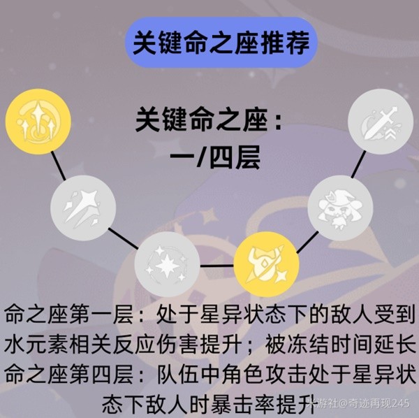 3.命座方面,莫娜的每个命座都带来稳定的提升,其中一命增加元素反应伤害价值较大,常打水元素相关反应伤害的旅行者可以考虑抽取,其他命座不推荐刻意抽取,抽其他角色时均有概率获取。