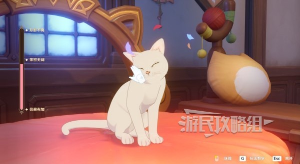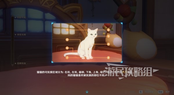 与猫咪玩耍时需要抚摸猫咪不同的部位来增加好感度。