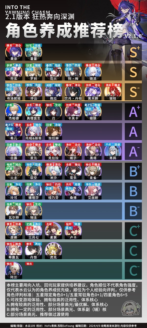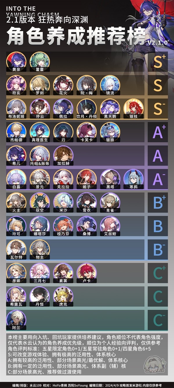 《崩坏星穹铁道》2.1版本随着新角色的不断加入,不知道开拓者们有没有烦恼过自己该优先培养哪个角色呢?下面请看由“水云109”为大家分享的《崩坏星穹铁道》2.1上半角色养成推荐榜,希望可以帮到大家。