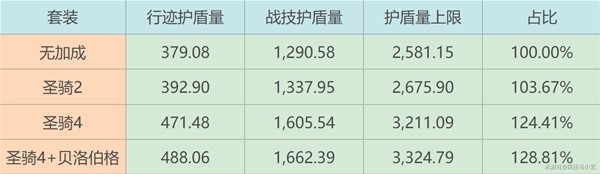 ①圣骑4的提升显著,对比无加成,行迹的护盾量提升,接近100,护盾量的双倍上限,提升600以上,收益24%左右
