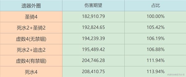 ①伤害期望最高的是死水4,对比纯御流的圣骑4,伤害提升接近14%。对比死水2的散搭,4件套的伤害收益领先6%-8%左右,追击2的散件对比圣骑2的散件,提升较小。另外,虚数4件套的收益不稳定,在敌人没有禁锢状态时,收益和死水2的散件差不多,有禁锢状态时,只比死水4低2%左右。