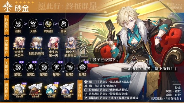 解析:套装效果常态提高暴击率,可以进一步降低砂金的暴击率需求,而后续的终结技与追加攻击增伤效果要求有50%暴击率,对于砂金来说,只要吃满了行迹额外能力的防御力数值,就可以拥有53%的暴击率,直接激活套装效果。砂金的主要输出来源就是追加攻击与终结技,增益直接覆盖了砂金的主要输出技能,提升幅度还不错。是输出型砂金的毕业选择。