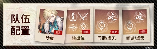 常规配队:砂金+输出位+辅助位+辅助位