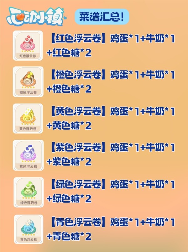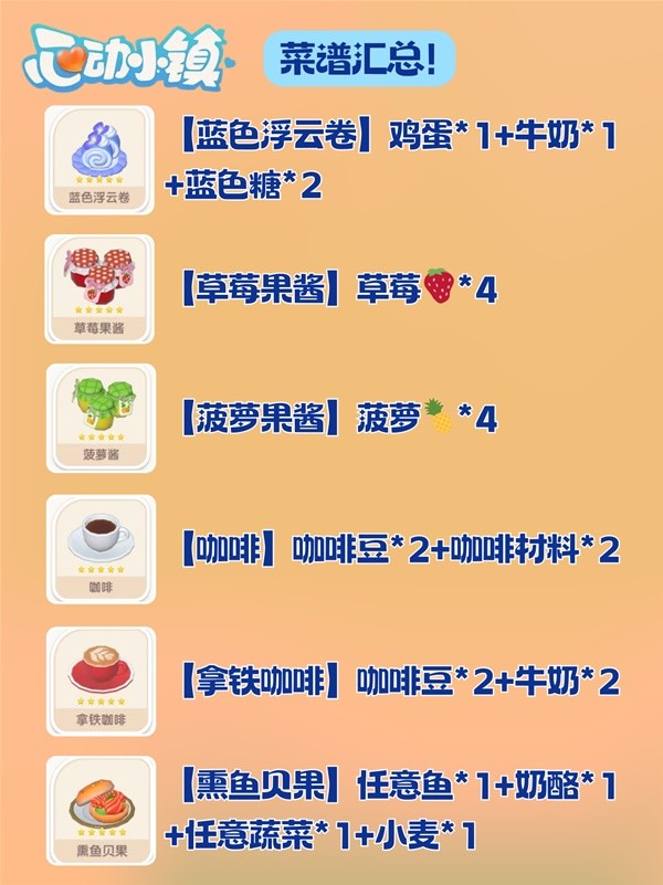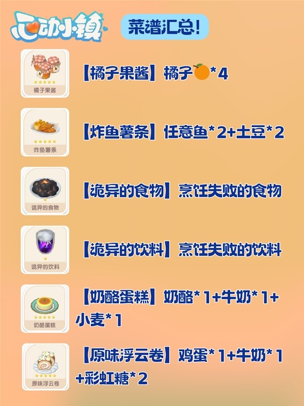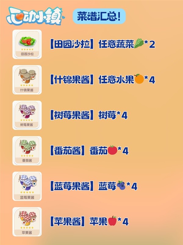 《心动小镇》烹饪是游戏中的爱好之一,很多玩家不清楚公测版本的菜谱都有哪些,下面请看由“猪KK”为大家带来的《心动小镇》烹饪菜谱一览,希望可以帮助到大家。