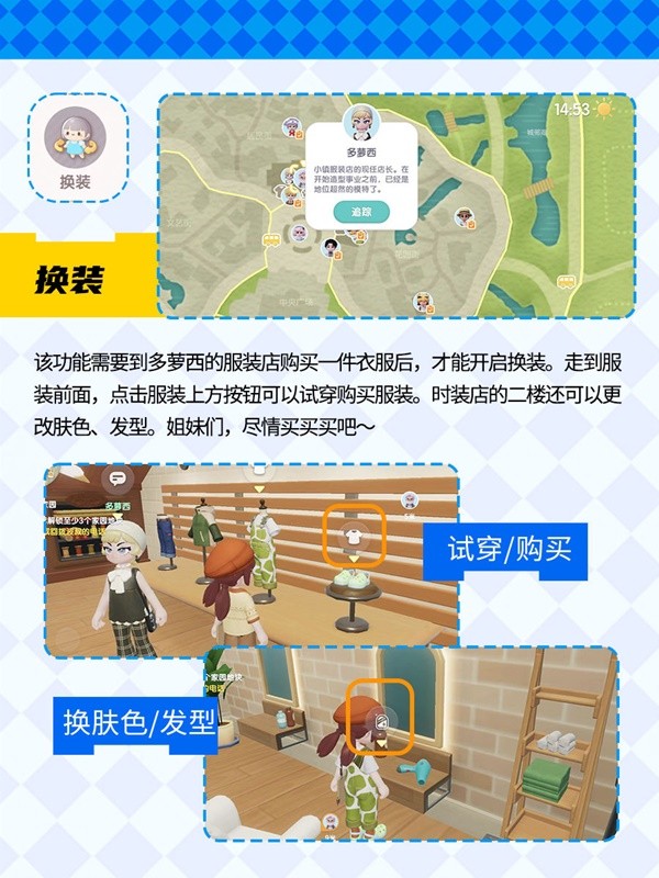 6.【换装】该功能需要到多萝西的服装店购买一件衣服后,才能开启换装。走到服装前面,点击服装上方按钮可以试穿购买服装。时装店的二楼还可以更改肤色、发型。姐妹们,尽情买买买吧~