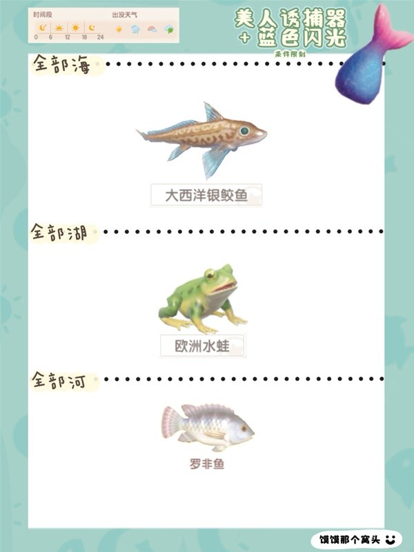 3、居民们解锁美人鱼诱捕器后记得多存钱购买,因为有部分鱼需要美人鱼诱捕器+蓝色闪光(蓝色闪光的触发一般是要两人一起钓鱼使用美人鱼诱捕器的时候会出现,但经过测试后发现,一个人钓鱼使用美人鱼诱捕器也会出现蓝色闪光,但概率比较低。);