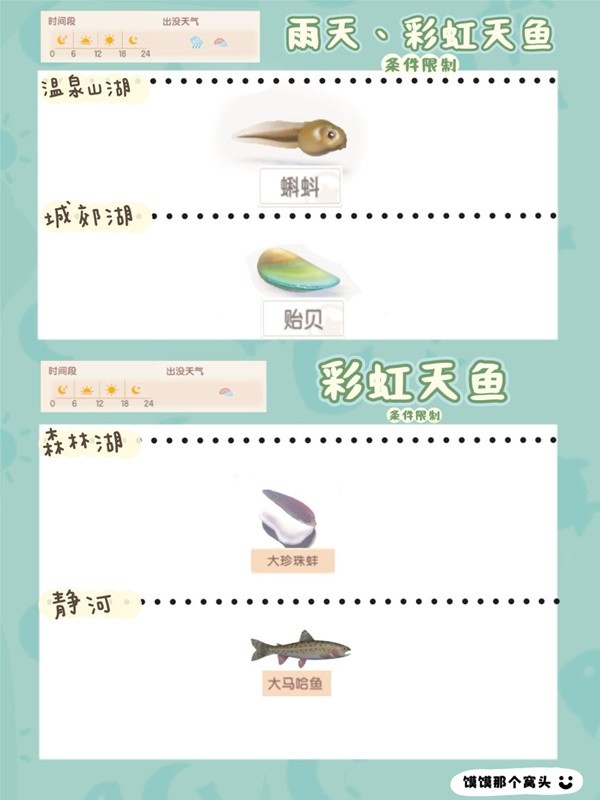 2、雨天和彩虹天目前是一周一次所以居民们要格外注意,有些鱼和昆虫、鸟都会在这种时间出现。