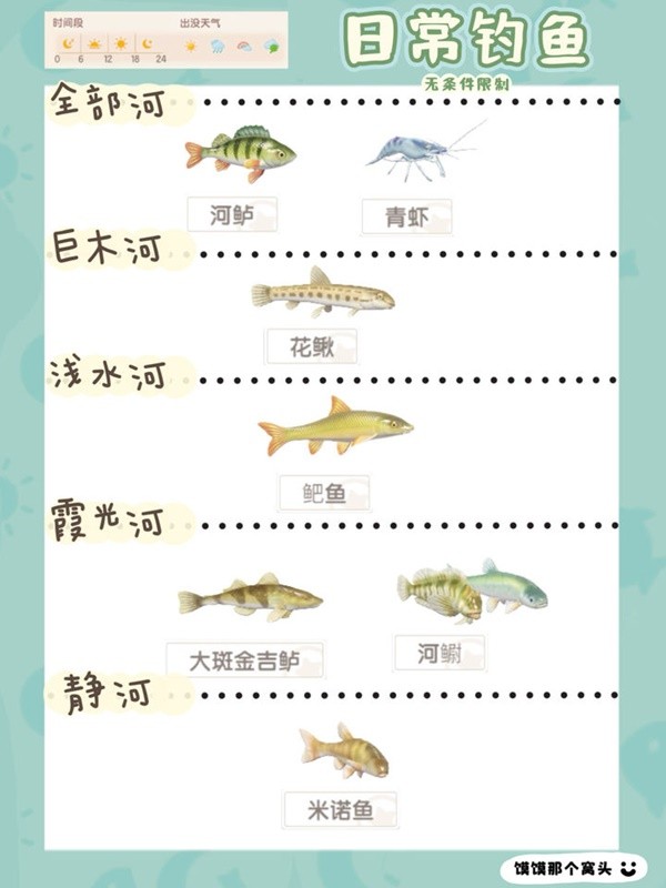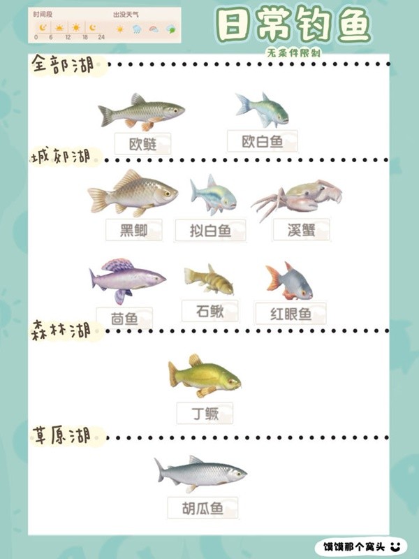 《心动小镇》中的玩法除了种田外,玩家们还能在游戏中钓鱼,那么游戏里都有哪些鱼呢?下面请看由“馍馍那个窝头”带来的《心动小镇》1-6级钓鱼图鉴,希望对大家有用。