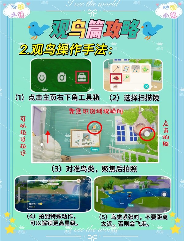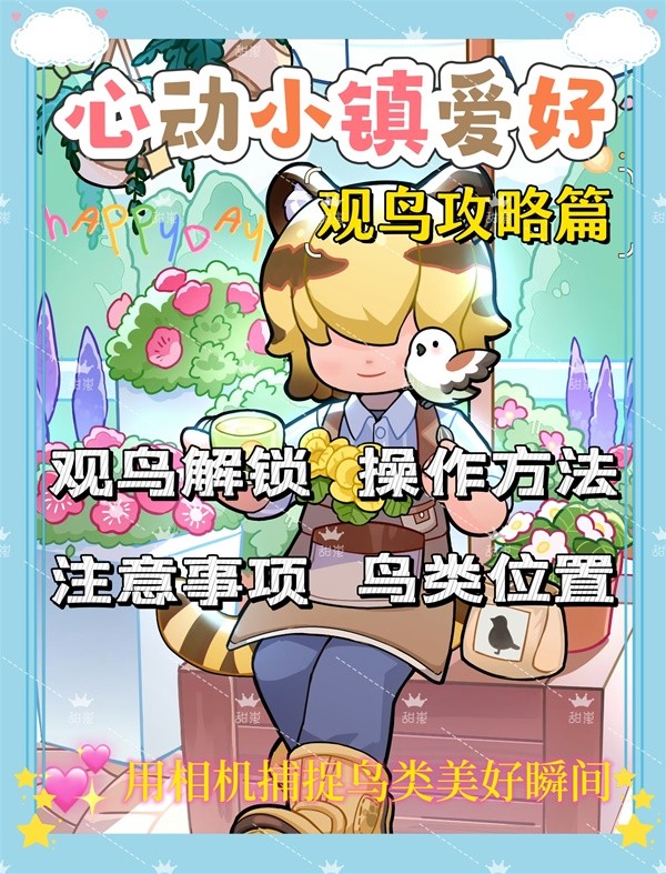 《心动小镇》观鸟是游戏中的爱好之一,很多玩家还不清楚观鸟的操作玩法与注意事项,下面请看由“爱游戏的甜崽”为大家带来的《心动小镇》观鸟操作手法与注意事项,希望可以帮助到大家。