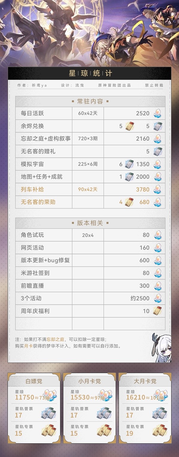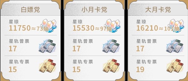 2.星琼总数如下(白嫖党88抽,小月卡党112抽,大月卡党120抽)