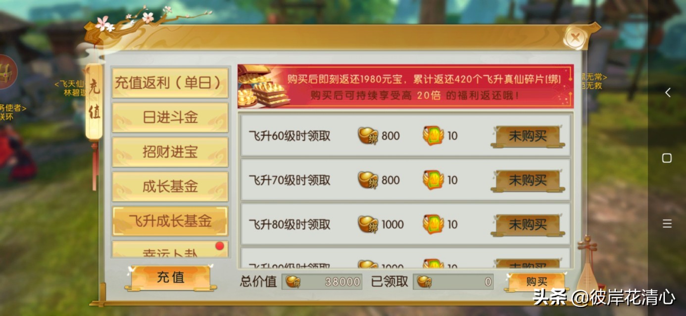然后飞升之后可以购买飞升成长基金。购买飞升成长基金之后,玩家从飞升60级开始,每升10级可以领取大量元宝返利和飞升真仙碎片(真仙碎片是制作真仙装备的关键材料,而真仙碎片在游戏中其它途径中获取也比较少)。可以从飞升60级开始领取到飞升160级。