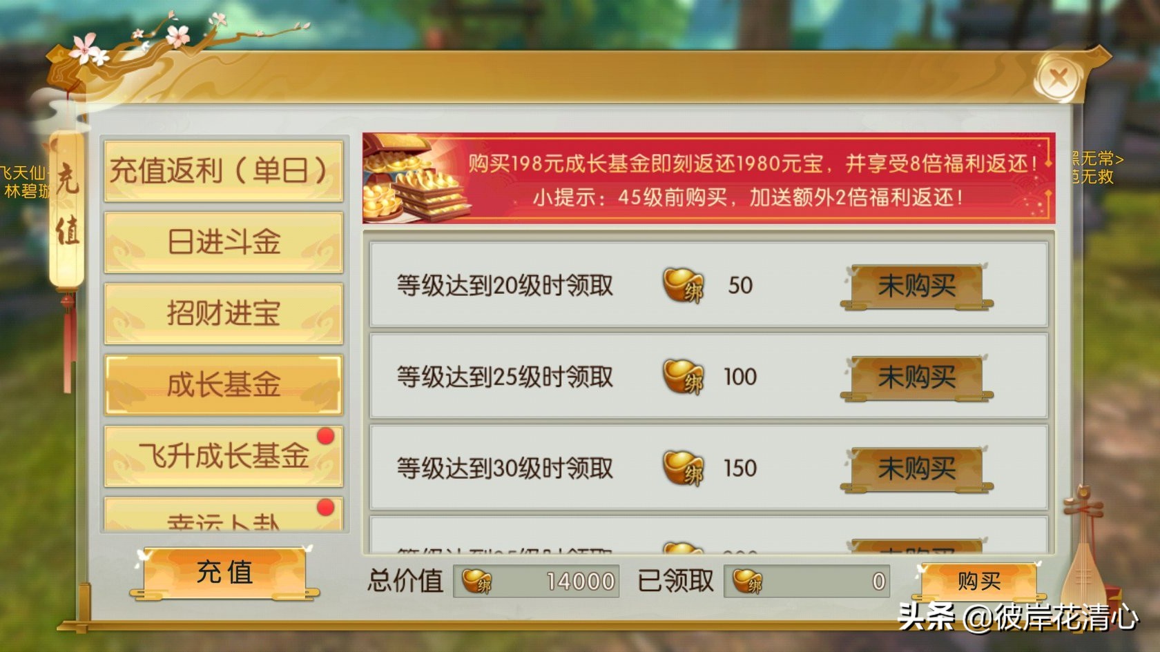其次对于条件允许的玩家,可以购买成长基金。购买成长基金之后,玩家20级开始,每升五级就可以领取金额不等的绑定元宝,可以从20级一直领取到150级,最终可以获得8倍元宝返利,最好在20级之前就购买可以获得最大返利!