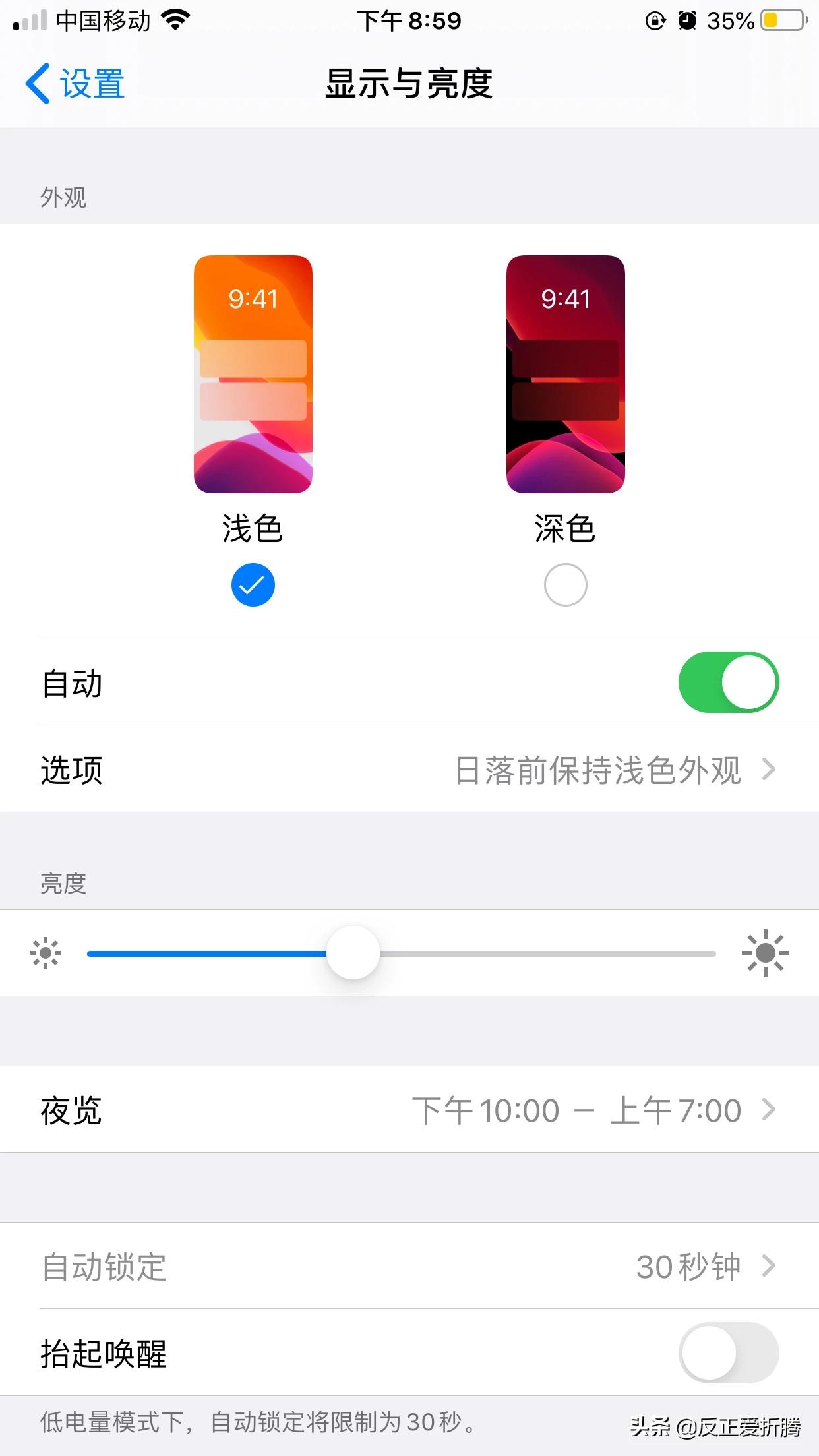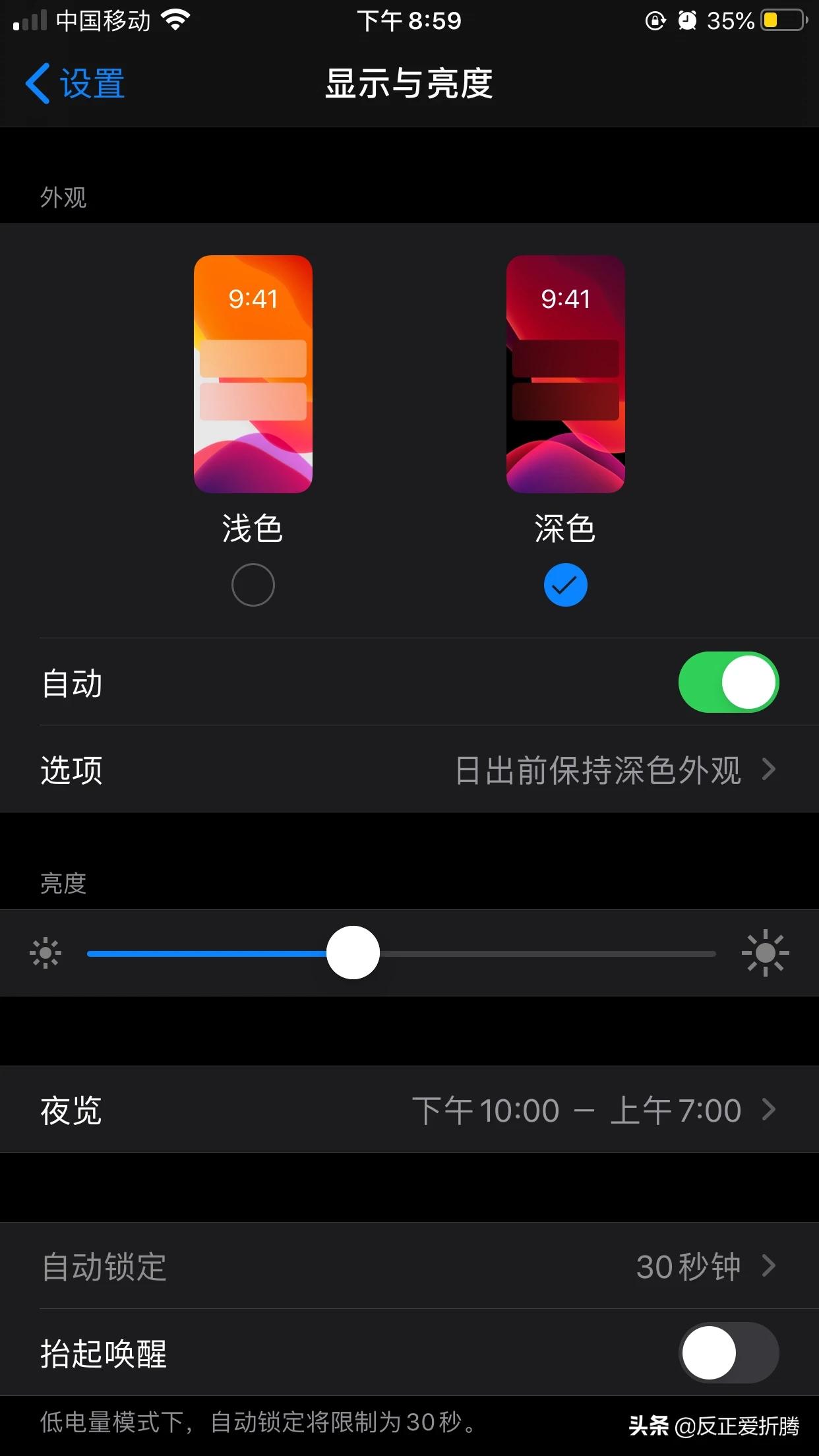 iPhone自IOS13开始加入深色模式,深色模式说白了就是一个主题,切换深色模式就相当于给iPhone换了一个主题,从浅色模式的白底黑字变为了黑底白字。iPhone深色模式可在设置-显示与亮度中切换,点击自动按钮可以根据日出日落或者自定义的时间自动切换。