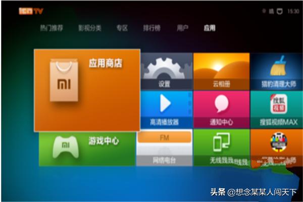 2.在小米盒子上切换到“应用”选项卡,再点击下方的应用商店进入下一页面。应用商店很好找,进入小米盒子主页就有鲜艳醒目的提示。