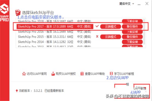 2、安装完成后,点击SUAPP图标,在弹出的对话框中,点击你电脑已经安装的SU版本。然后点击【启动SUAPP】。