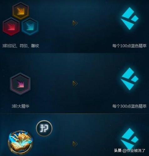 首先提一下蓝色精粹是用来干什么的蓝色精粹可以用来升级英雄碎片,橙色精粹可以用来升级皮肤碎片,比如一个寒冰英雄碎片,如果要把它升级成永久英雄就得需要一个寒冰碎片+350个蓝色精粹,价格越高的英雄需要的蓝色的精粹更多。