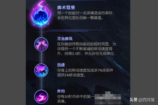 (3)主符文也可以选择巫术系:奥术彗星+灵光披风+迅捷+焦灼这同样是一套十分不错的符文加点,奥术彗星/焦灼提高消耗能力,灵光披风/迅捷加强大招的移动。