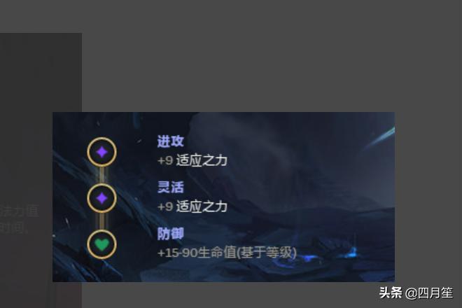(5)进攻:+9适应之力/灵活:+9适应之力/防御:15-90生命值稻草人不需要攻速,CD也能够很轻松的叠加到40%,所以选择适应之力最合适。