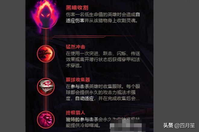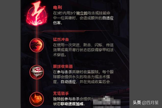 (1)电刑+猛然冲击+眼球收集器+无情猎手电刑能够提供一个额外的爆发伤害,无情猎手则是增加了稻草人的回复能力,另外两个属于常规符文,没啥争议。