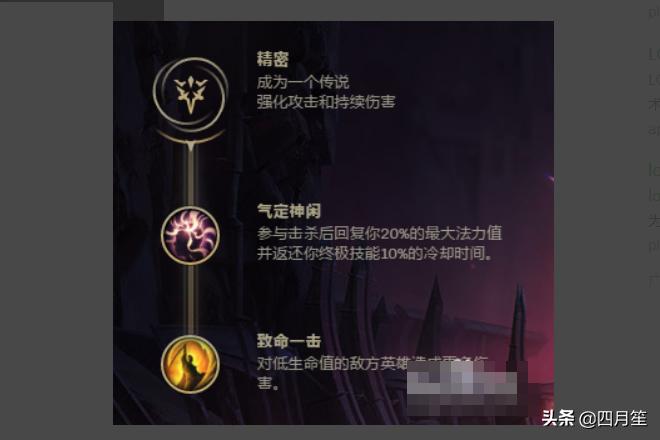 (4)副符文:精密系气定神闲+致命一击气定神闲对于大招的CD缩减十分厉害,而稻草人团战主要靠的就是大招,致命一击加成伤害。