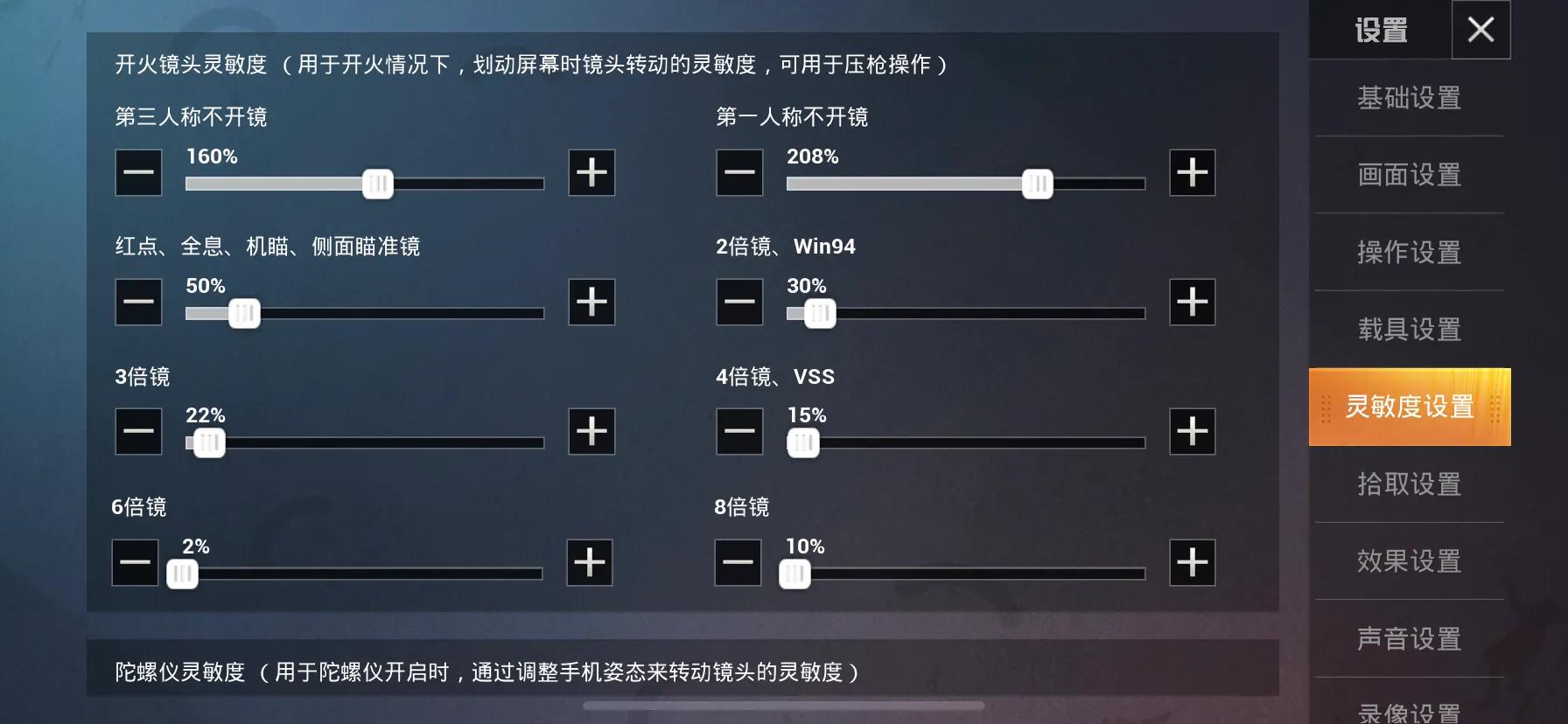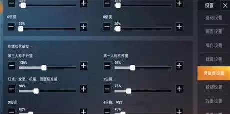高倍镜的灵敏度一般都是放很低,而且是倍数越高灵敏度越低。一般来说从4倍镜开始就需要比较低的灵敏度,可以设定在25±3的范围之内,六倍镜设定在20±3的范围之内,八倍镜设定在15±3的范围之内