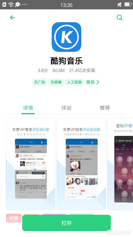 但是去应用市场搜找,虾米音乐下载,然后才是9000万左右,而酷狗就不一样了,它的下载量就是21.4亿左右。也算是非常好高端的一个软件了。