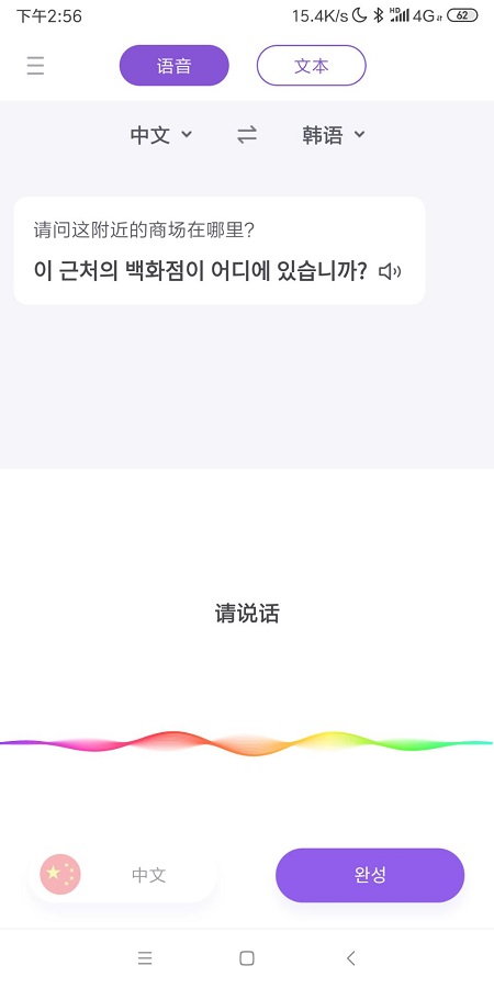 5在我们的手机翻译软件"语音翻译器"中具有中韩翻译在线互译功能,点击中文按钮旁的韩文标志,开始说话,录音结束后点击完成,开始进行中韩语在线互译页面。