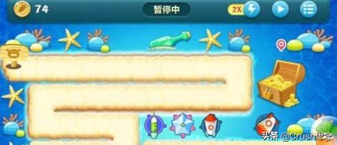 打这一关的时候,也没有什么困难的,最大的困难,就是我们没有足够的金币,所以,在这个时候,最好是不要随便造炮塔了,否则你会没有钱去做别的。最好是在中间的部分造一排冰冻星星,可以让那些怪物的行进速度减慢。而这张地图的输出基本全在右边,而左边的飞机和蘑菇只能在减速的同时磨血,右边的鱼骨塔和火箭最终会成为炮塔里最强的攻击武器。大家要注意了,炮塔分布在水晶覆盖的范围最好了,因为这样容易被打到,而且不要忘记了建船锚,可以更快地道理道具,获得宝箱。