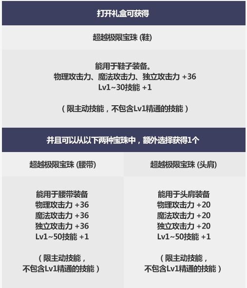 首先这次购买国庆套附赠的春节宝珠非常良心,这次可以选择两个宝珠,鞋子为默认,只能从腰带和头肩选择一种,腰带宝珠属性为三攻+36,1~30技能,头肩为三攻+15,1~50技能+1。