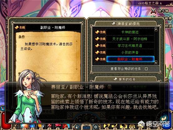 角色等级达到60级,可以找莎兰接受任务【专门职业·附魔师】,任务要求非常滴简单,就是达到60级~而且还奖励500金~接着找赛利亚接受任务【副职业-附魔师】