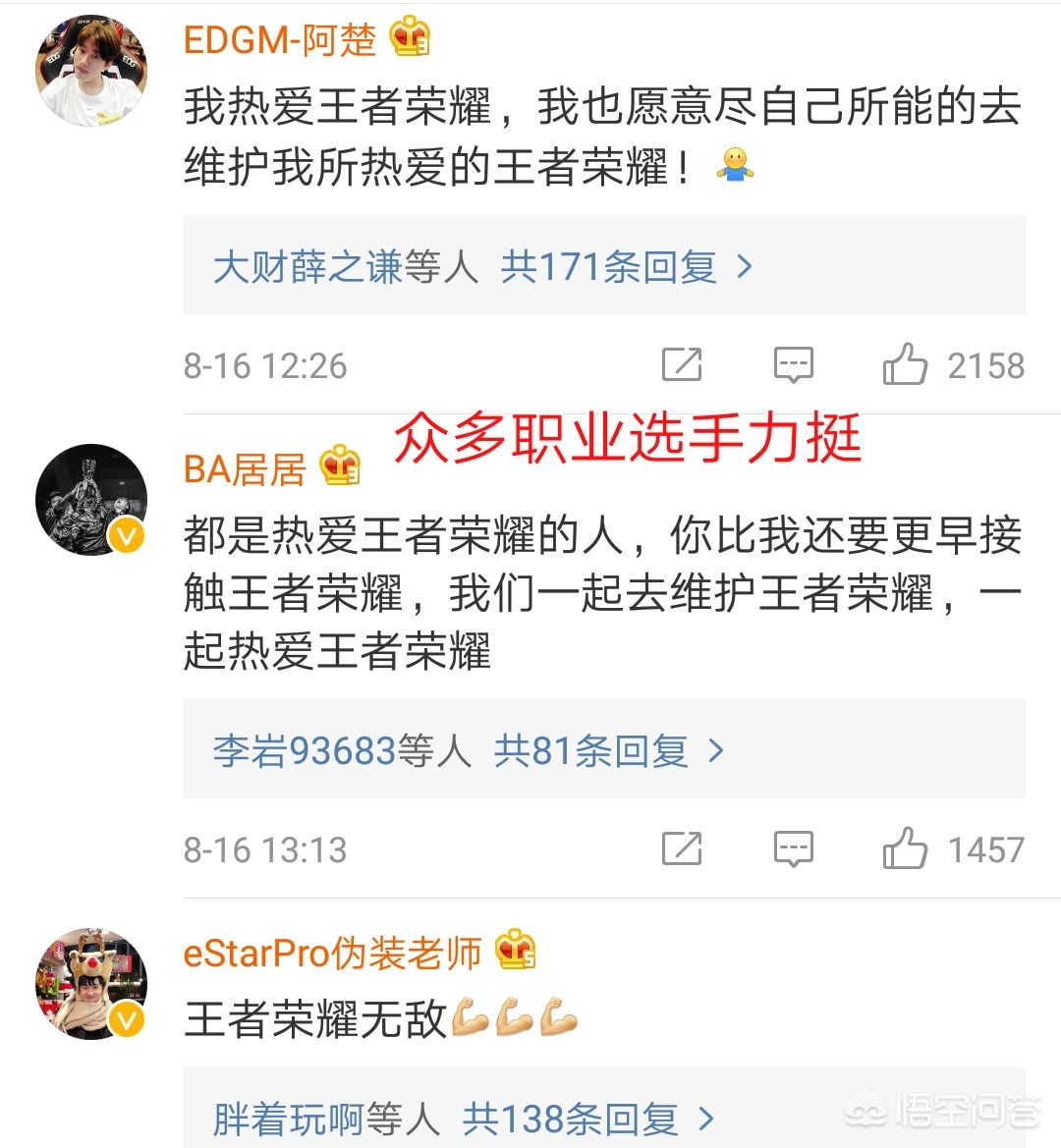 他的发文也引来王者荣耀圈子众多职业队员以及解说的支持,可以看出寒夜在王者荣耀圈子里举足轻重的地位,巨人是不会被打倒的! 寒夜作为早一批接触王者荣耀的人,他有权利对自己所玩的游戏受到不公正的言论冲击做出反映,无论是否过激,经典认为都情有可原,因为他是真的把王者荣耀当做生活的一个人。